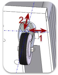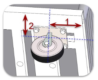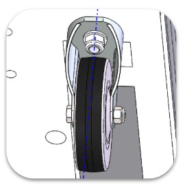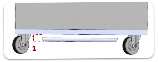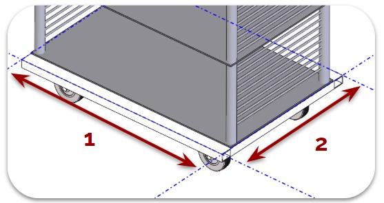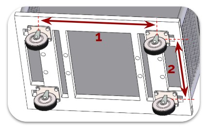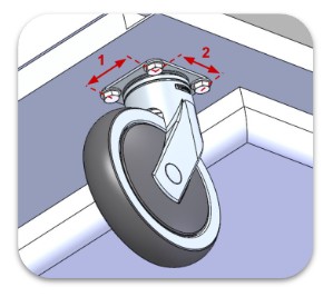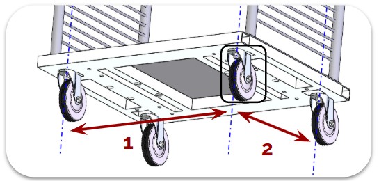 Embase de chariot composée de deux roues centrales fixes qui supportent la charge, et quatre roues pivotantes